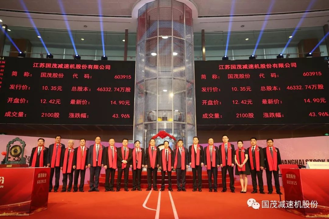2019年6月14日上午9點30分,江蘇國茂減速機股份有限公司上市儀式于上海證券交易所舉行,宣告江蘇國茂減速機股份有限公司正式上市,股票簡稱為“國茂股份”,股票代碼為“603915”。這是國茂股份一個值得記載的歷史時刻,這也是一個新起點,國茂股份風帆高揚、破冰踏浪,開啟登陸資本市場的新征程!